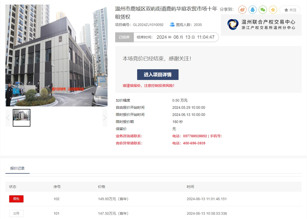 2024年6月13日,溫州聯(lián)合產權交易中心有限公司(下稱溫州聯(lián)交中心)受溫州市鹿城區(qū)國有資產經營集團有限公司委托,在“浙交匯”平臺掛牌的溫州市鹿城區(qū)雙嶼街道鹿嶼華庭農貿市場十年租賃權項目經過102輪充分競價順利成交。項目以首年租金70萬元的價格掛牌披露,最終以首年租金149萬元的價格成交,溢價79萬元,溢價率高達112.86%。