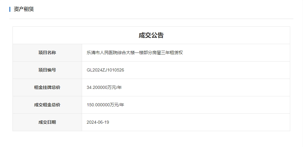 近日,受出租方委托溫州聯(lián)合產(chǎn)權(quán)交易中心有限公司掛牌的樂(lè)清市人民醫(yī)院綜合大樓一樓部分房屋三年租賃權(quán)在“浙交匯”平臺(tái)順利成交。項(xiàng)目以首年租金34.2萬(wàn)元的價(jià)格掛牌,經(jīng)過(guò)充分競(jìng)價(jià),最終以首年租金150萬(wàn)元的價(jià)格成交,溢價(jià)115.8萬(wàn)元,溢價(jià)率高達(dá)338.6%。